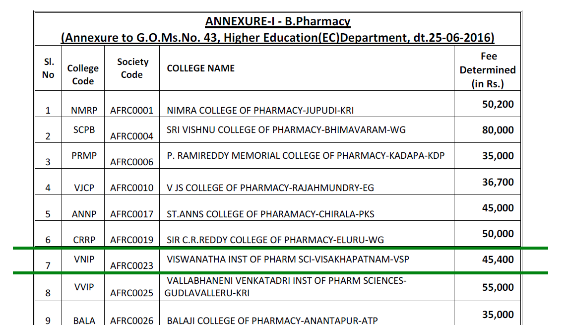 PHARM.D Pharm. D. or Doctor of Pharmacy course is a six year program including five years of study and one year of internship or residency. Minimum qualification for admission to Pharm. D. Course – A pass in any of the following examinations: 1) 10+2 examination with Physics and Chemistry as compulsory subjects along with Mathematics or Biology. 2) A pass in D. Pharm. course from an institution approved by the Pharmacy Council of India under section 12 of the Pharmacy Act. 3) Any other qualification approved by the Pharmacy Council of India as equivalent to any of the above examinations. The qualified students can join Pharm. D. through EAMCET counseling or through Management quota. Pharm. D. fee for each year Rs. 68,000. B.PHARM B.Pharm or B.Pharmacy or Bachelor of Pharmacy degree is a four-year program with both annual and semester schemes available. Under JNTU Kakinada, B.Pharm course is in semester pattern. In order to be eligible for admission into B.Pharm course, one must pass with at least 50% marks in 10 + 2 (Intermediate or an equivalent examination) with biology/biotechnology as one of the subjects. Intermediate or equivalent qualified students can join B.Pharm through EAMCET counseling or through Management quota. D.Pharm (Diploma of Pharmacy) holders are eligible for admission into B.Pharm into the second year of study directly through Lateral entry. D.Pharm students can join B.Pharm course through E-CET counseling or through Management quota. B.Pharm. Fee for each year is Rs. 45,400/- FEE PARTICULARS as per AFRC M.PHARM M.Pharm or M.Pharmacy or Master of Pharmacy is a post graduate course of 2 years duration with semester system. After completion of B.Pharm degree students can join for M.Pharm course. M.Pharm course has various specializations in the field of pharmacy. B.Pharm students can join M.Pharm course through GPAT or PGECET counseling or through Management quota. In our VNIPS, two specializations are offered under M.Pharm course M.Pharm. Fee for each semester is Rs. 55,000/- NOTE: A student who completes the course and want to register as Pharmacist in India, the course offered college must be approved by AICTE (All India Council for Technical Education) and PCI (Pharmacy Council of India). |